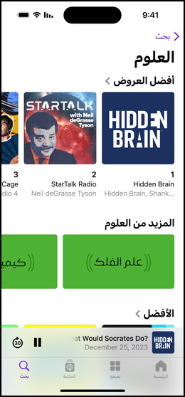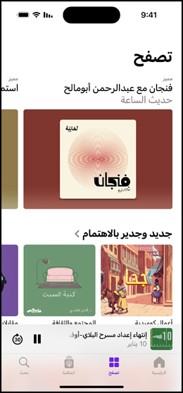 • تطبيق Apple Podcasts هو أفضل تطبيق للعثور على الملايين من برامج البودكاست الأكثر شهرة في العالم ومتابعتها والاستماع إليها. ويمكنك أيضاً اكتشاف برامج جديدة بسهولة من خلال محتوى منتقى بعناية.