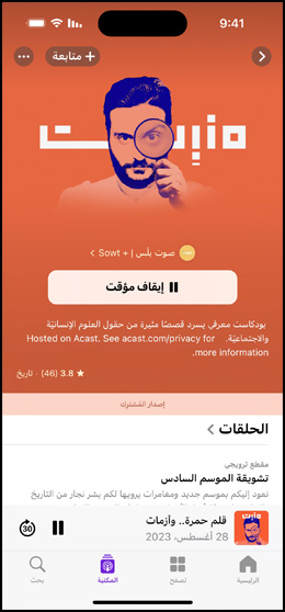 • يمكنك ذلك بالتأكيد. إذا كنت تريد إنشاء برنامجك الخاص ونشره على Apple Podcasts، فراجع الموارد المتاحة على podcasters.apple.com‏