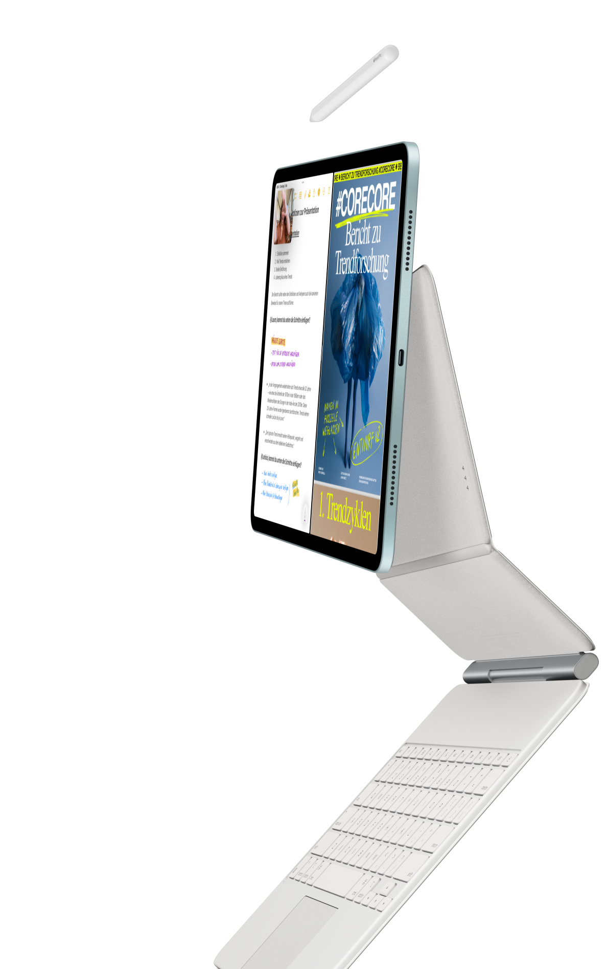 Ein iPad Air ist mit dem Magic Keyboard für das iPad Air und dem Apple Pencil Pro verbunden