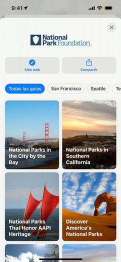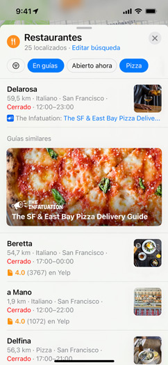 • Las guías seleccionadas son listas de lugares creadas por socios de confianza para ayudarte a encontrar sitios interesantes a los que ir a comer, comprar, quedar con amigos o, sencillamente, explorar. Mapas ofrece más de 1.000 guías seleccionadas en ciudades de todo el mundo. En iOS 15, toca Explorar Guías en Mapas para ver las guías recomendadas por los editores.
