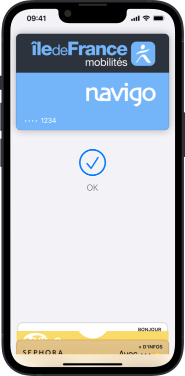 Vous pouvez utiliser votre Navigo sur un iPhone Xs (ou modèle ultérieur) mis à jour vers iOS 17.5, et sur une Apple Watch Series 6 (ou modèle ultérieur) dotée de watchOS 10.5.
