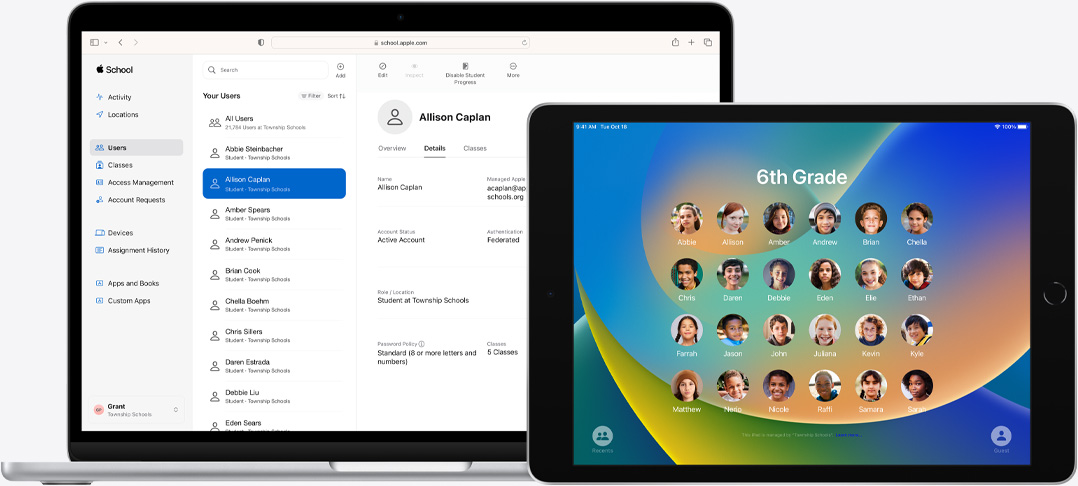 Az Apple School Managerrel Christopher Veljanovski, a helyi műszaki támogatási felelős könnyen biztosíthatja minden tanulónak és tanárnak, amire szükségük van az eszközükön. Mindenki egyedi Felügyelt Apple ID-t kap, így a regisztrálás rendkívül egyszerű. Az Osztályterem alkalmazással a tanárok kioszthatják az óraterveket, és valós időben tekinthetik át a tanulók munkáját. A tanárok az eszközeiken elérhető Fájlok alkalmazással pedig privát módon és biztonságosan oszthatják meg egymás között a feladatokat.