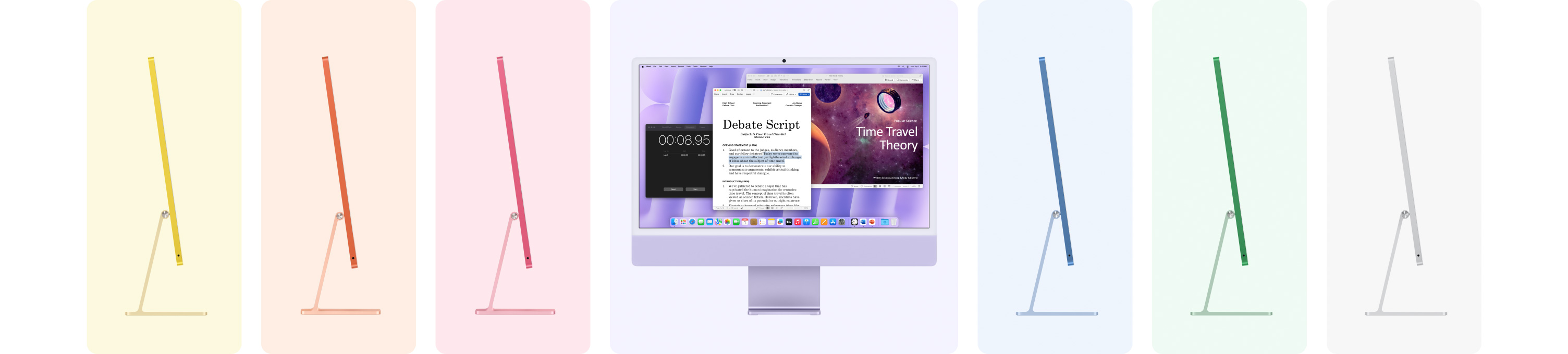 7 iMacs in different colors (Green, Yellow, Orange, Pink, Purple, Blue, Silver) in a accordion arrangement