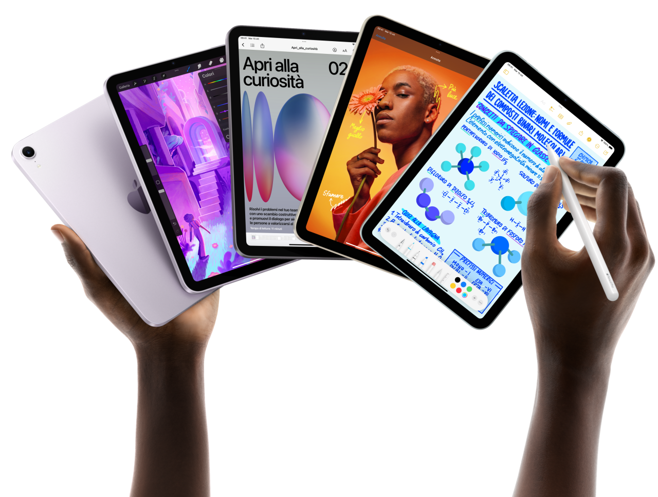 Cinque iPad mini disposti a ventaglio sorretti da una mano. Uno mostra la fotocamera posteriore, gli altri quattro sono visti di fronte. Una Apple Pencil Pro viene usata per prendere appunti.