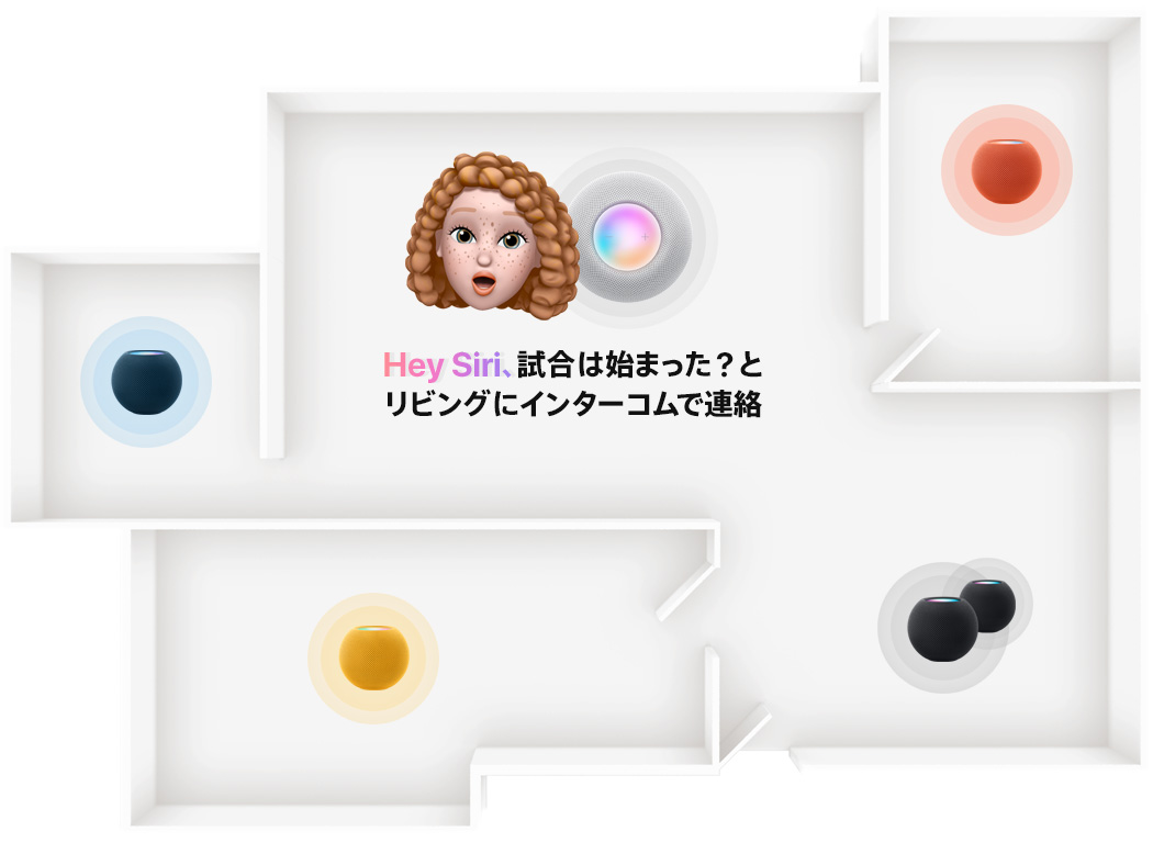 家の間取り図。各部屋にHomePodまたはHomePod miniが置かれている。ミー文字のキャラクターが話す。個々のスピーカーがハイライトされる