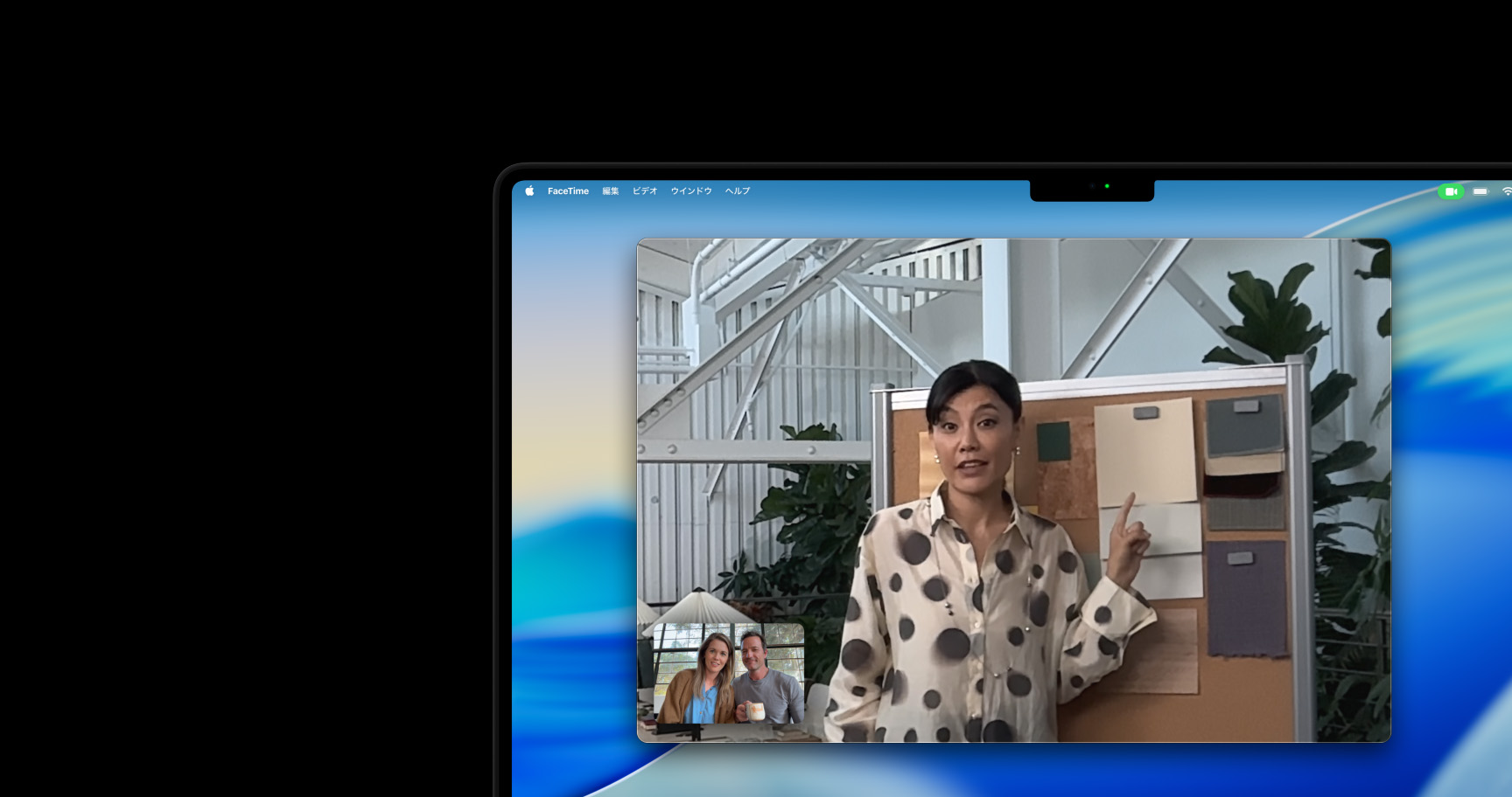 カメラ。12MPセンターフレームカメラは、あなたが動き回ってもフレームから外れないように調整。あなたのワークスペースを上から映して共有できるデスクビューにも対応しています。