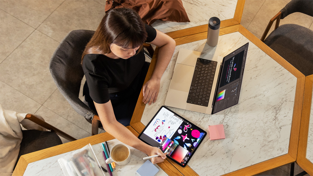 Les idées lui viennent dans les parcs, les cafés – n’importe où, n’importe quand, dit-elle. Le Dictaphone de l’iPhone lui permet de saisir au vol ses réflexions. Ensuite, elle esquisse ses idées avec l’Apple Pencil sur iPad et finalise ses compositions à l’aide d’Adobe Creative Suite sur MacBook.