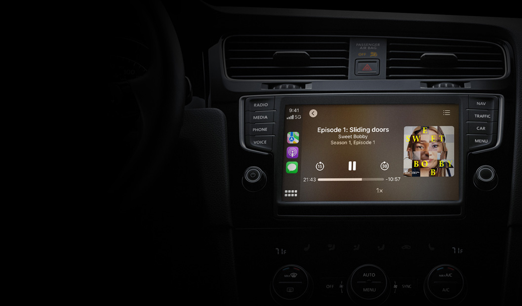• CarPlay lets you connect your iPhone to your car’s built-in display and is available in over 800 different models. It makes it easy to access the Podcasts app on your vehicle’s touchscreen. Apple Podcasts also comes pre-installed in selected cars.