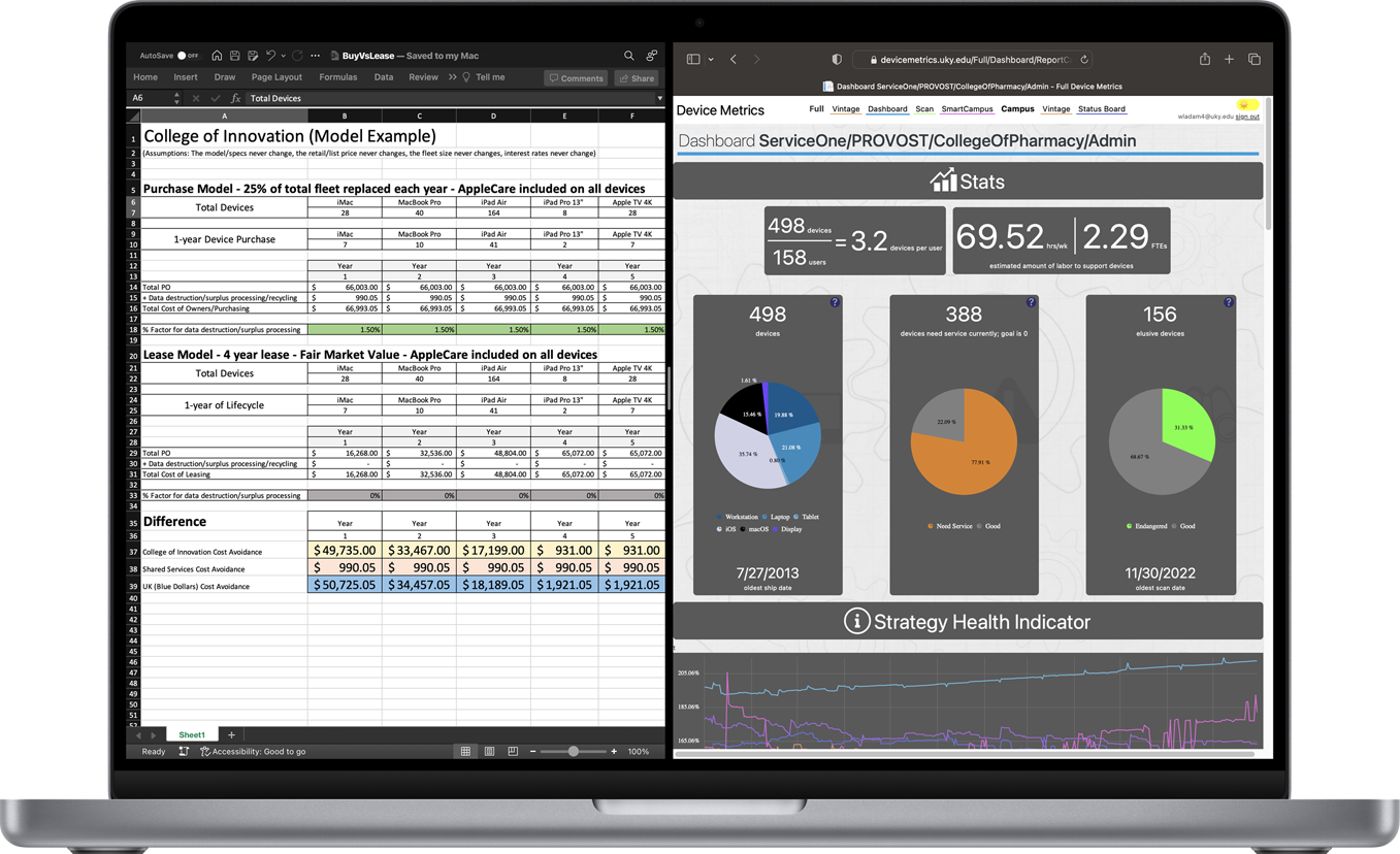 kracht achter de analyses van Bill, van berekeningen tot visualisaties. Split View geeft gegevens in Excel op een elegante manier weer naast het technologiedashboard van de University of Kentucky.