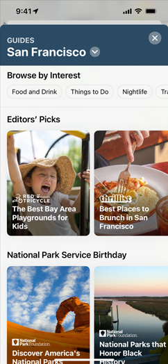 • Curated Guides are lists of places created by trusted partners to help you find great places to eat, shop, meet friends or just explore. Maps offers more than 1,000 curated Guides in cities around the world. In iOS 15, tap Explore Guides in Maps to see Guides recommended by Maps editors.