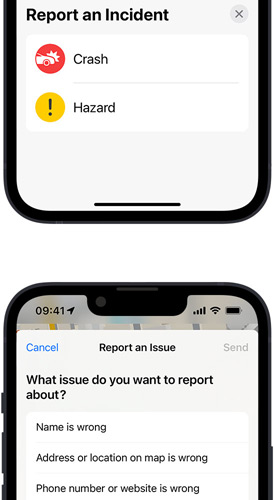 Incorrect lunch hours listed at your favourite café? Old mattress in the middle of the road? Whatever issue you encounter, it’s fast and easy to report it in Maps. Edit and submit updated information about a business directly in the place card interface. And report an accident or hazard safely and easily with Siri. Just say “There’s an accident up ahead” or “There’s something on the road” and Siri will file the incident for you. If an incident displayed on the map has been cleared, you can report that too — all while keeping your hands free and your focus on the road.